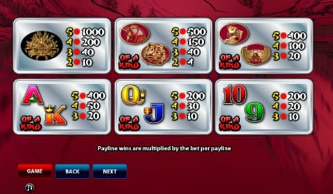 In this game, you have to land any winning combinations to get credits, with at least 3 identical symbols or a figure that includes a Wild symbol in it. As always, the low-paying items are represented by the 9, 10, J, Q, K and A royals taken from the classic poker games, each decorated with small details like emeralds, golden crowns and shields. The two latter can pay up to 400x your stake when you land 5 of them in a winning combination.