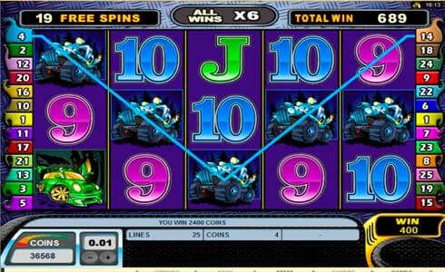 The theme used in this game is also wonderfully composed; it uses checkered aluminum plating for the slots-background that comes with flaming decals on either side of the reels that marks various pay-lines. Moreover, the button panel is also given an overhaul; it comes with a gas dial for the coin selector and also has a red start button that is conveniently used to start the spinning of the reels.