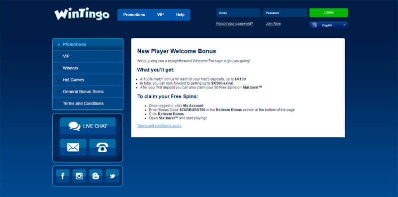 The Wintingo is a fine choice because it's a no-download casino with an excellent welcome offer. The Cashback program is also one of the most substantial benefactors that support the site. That's why we place it among the best instant play casinos: registering is easy, and you can quickly make a deposit, then claim the neat bonuses. The long list of this casino's games will certainly make you satisfied.